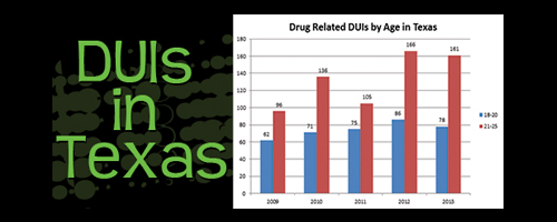 In 2013 there were a total of 2,760 people involved in alcohol related DUIs in Texas. Among these crashes, 33% involved drivers between the ages of 18-25. In the past five years, for drivers 18-25, alcohol related crashes remain the most common form of DUI incidents in Texas. However, drug related DUIs seem to be gradually increasing with the years.